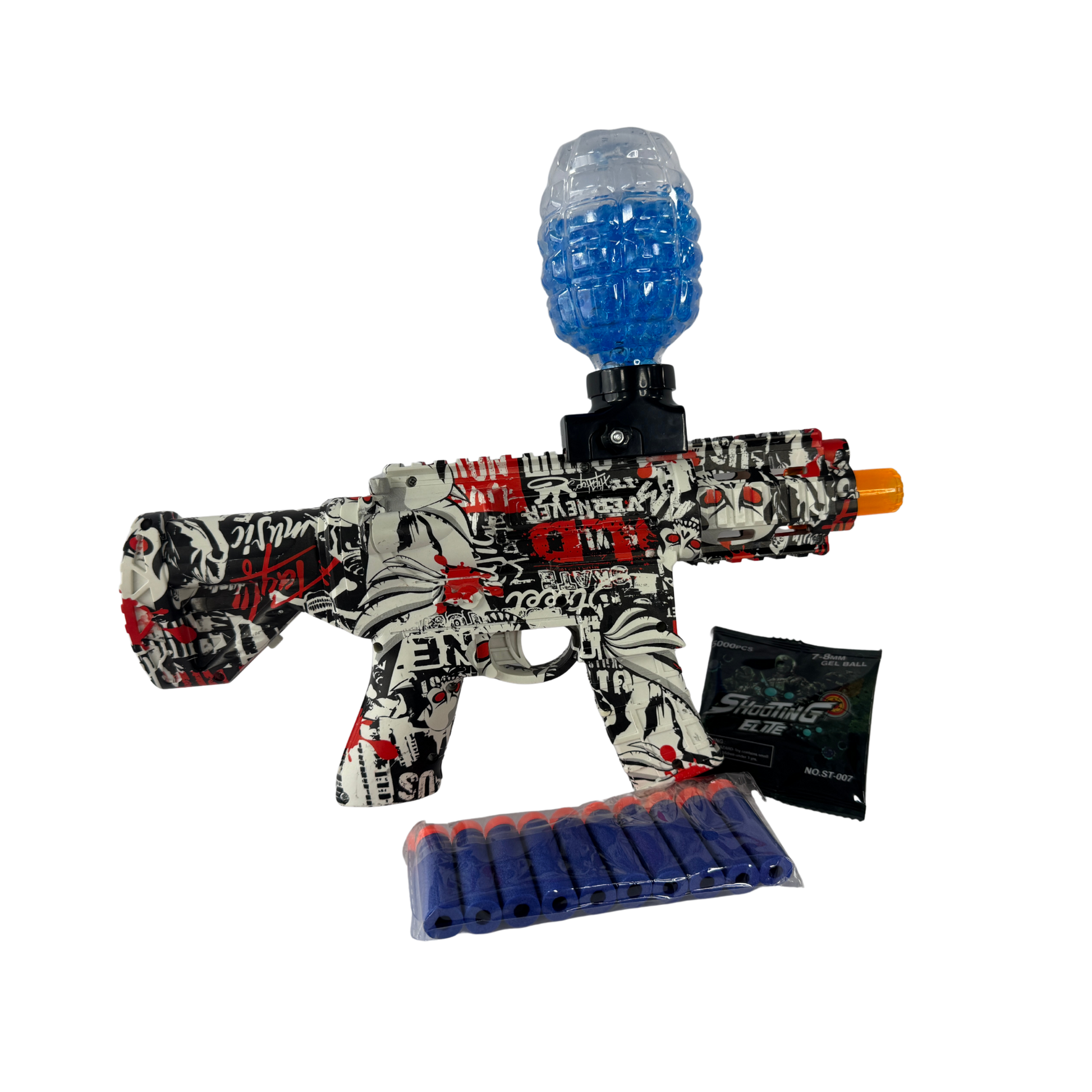 Disfruta de emocionantes partidas con esta pistola lanzadora de dardos y gel, diseñada con un moderno estampado urbano en tonos negro, blanco y rojo que le da un estilo único. Perfecta para actividades recreativas en interiores o exteriores, su construcción ligera facilita su uso por jóvenes y adultos.
