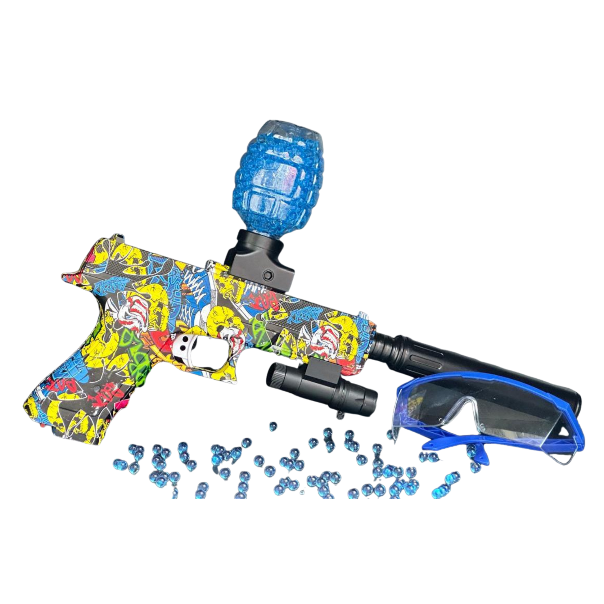 Pistola lanzadora de gel L-01 con diseño gráfico multicolor y visor de protección