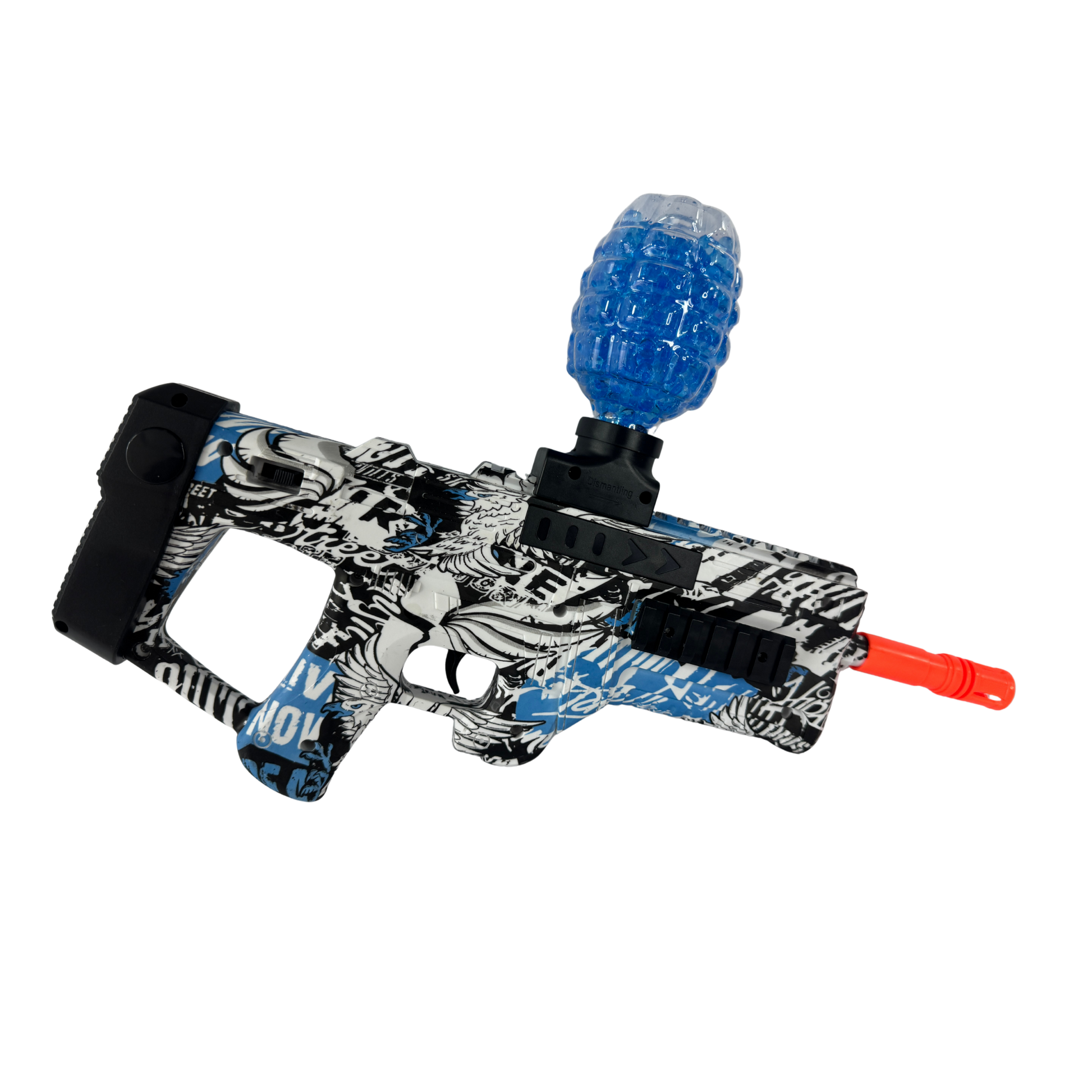 Pistola lanzadora de gel p90 azul con diseño urbano y depósito tipo granada